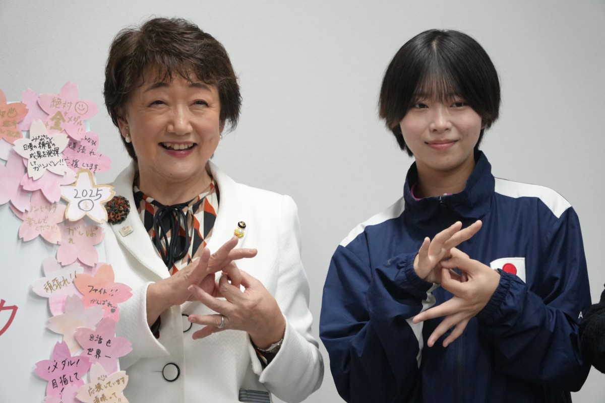 郡市長は冒頭のあいさつでは手話を交えながら「スポーツには国、人種、障害の有無などのさまざまな違いを越えて、熱狂と感動を生み出し、人と人、心と心をつなぐ力があると思っております。日本で初めての開催となるデフリンピックであれば、なおさら、日本国民の皆さまにも、その大きな力が届くものと思います」と佐藤さんを含めた3選手に激励の挨拶をしました。