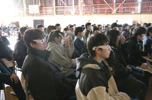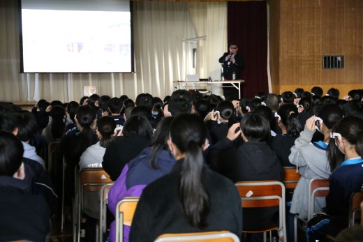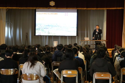 講演会には、全校生徒と保護者などおよそ300人が参加し、赤青メガネを使った立体画像で、仙台市街地を横切る活断層「長町-利府断層」の地形や、北仙台中学校周辺の身近な地形を確認しました。その上で、水本准教授は「防災において、水・食料の備蓄や避難所運営も大事だが、最も大切なことは、自然災害から命を守ること。そのためにも、先ずは自然災害をもたらす地形を知ることが必要である」ことを強調しました。