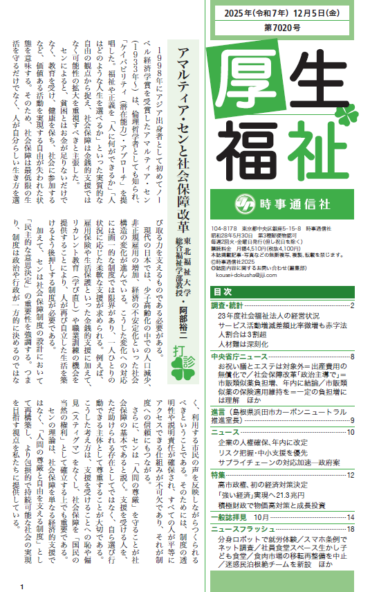 総合福祉学部教授の阿部裕二副学長が、時事通信社が発行する専門情報誌『厚生福祉』の巻頭「打診」に執筆しました。本欄は、社会保障や環境保全全般に関するテーマにスポットを当て、意見や提言をするコーナーです。第3回目は「アマルティア・センと社会保障改革」を題材に寄稿しました。