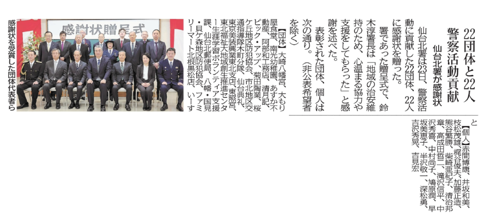 【新聞掲載情報】警察活動貢献 仙台北署から感謝状(生涯学習ボランティア支援課)