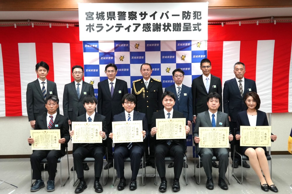 2月19日(木)に宮城県警察で「サイバー防犯ボランティア感謝状贈呈式」が行われ、県警サイバーセキュリティ統括官から本学ならびに本学の学生3名に対して感謝状が授与されました。