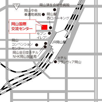 試験・スクーリング 情報ブック2014 会場案内 [岡山] 岡山国際交流センター 住所 〒700-0026 岡山市奉還町2丁目2-1 電話 086-256-2905 交通アクセス JR岡山駅西口から徒歩5分 駐車場 なし(近くの有料駐車場をご利用ください。身体障害者の方専用の駐車場は,1台分用意しています) 注意事項 指定された喫煙場所を除き,全館禁煙です