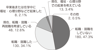 【卒業生のその後(続)】卒業生のその後(続)平成20年10月末に,平成18年3月〜平成20年3月の過去5回の卒業生(839名)を対象に郵送によるアンケート調査を実施しました。前号9部では回答者の中から「社会福祉士および精神保健福祉士資格取得者」に限定した「転職・就職状況」をご紹介いたしました。 今回は全回答者について転職・就職に関する調査の回答結果をご紹介します(平成21年1月15日現在,有効回答数359件・回収率42.8%)。就職・転職を検討されている方は参考にしてください。 1)転職・就職・再就職について N=381