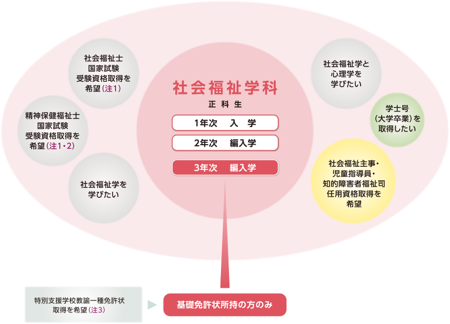 (注1) 社会福祉士・精神保健福祉士国家試験受験資格取得希望者は、正科生として入学し指定科目を履修したうえで卒業することが必要となります。