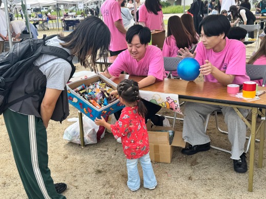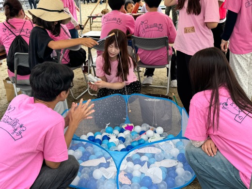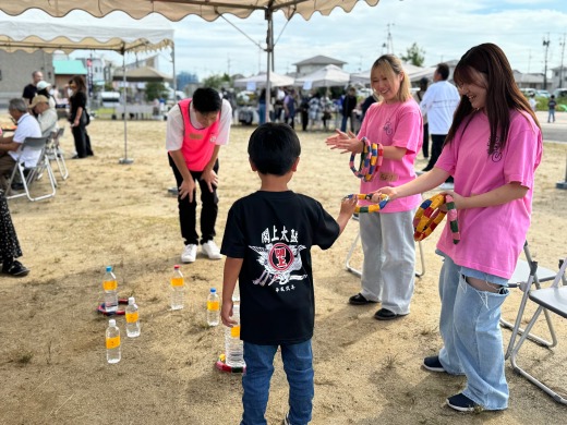 参加した22名の学生は「ちびっこ広場」を担当し、折り紙の魚釣りゲームや輪投げ、もぐらたたきなどを企画し、子どもたちと秋空のもと大いに楽しみました。