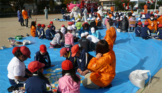 市民と本学学生が協働で製作した減災カルタを使用した「減災カルタ大会」では子ども達だけでなく、PTAの保護者も参加し、大人から児童まで学生の読み上げる読み句に合わせて絵札取りを競い合います。カルタを通して楽しみながら防災・減災知識を学ぶことができます。