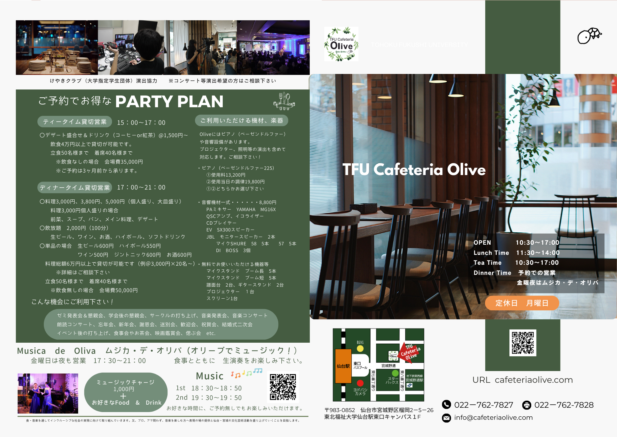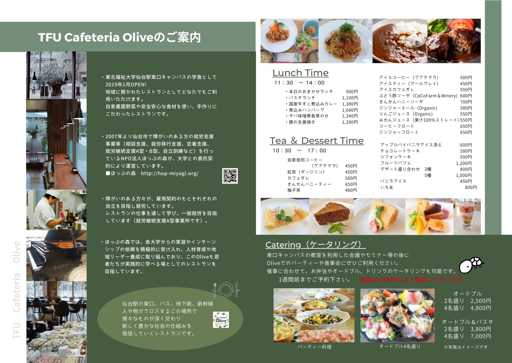 仙台駅から徒歩3分。東北福祉大学仙台駅東口キャンパスの1階。地域の食材や大学で生産した食材を中心に手作りにこだわったレストランです。自家焙煎珈琲と自家製ケーキもお勧めです。どなた様もごゆっくりお楽しみ下さい。