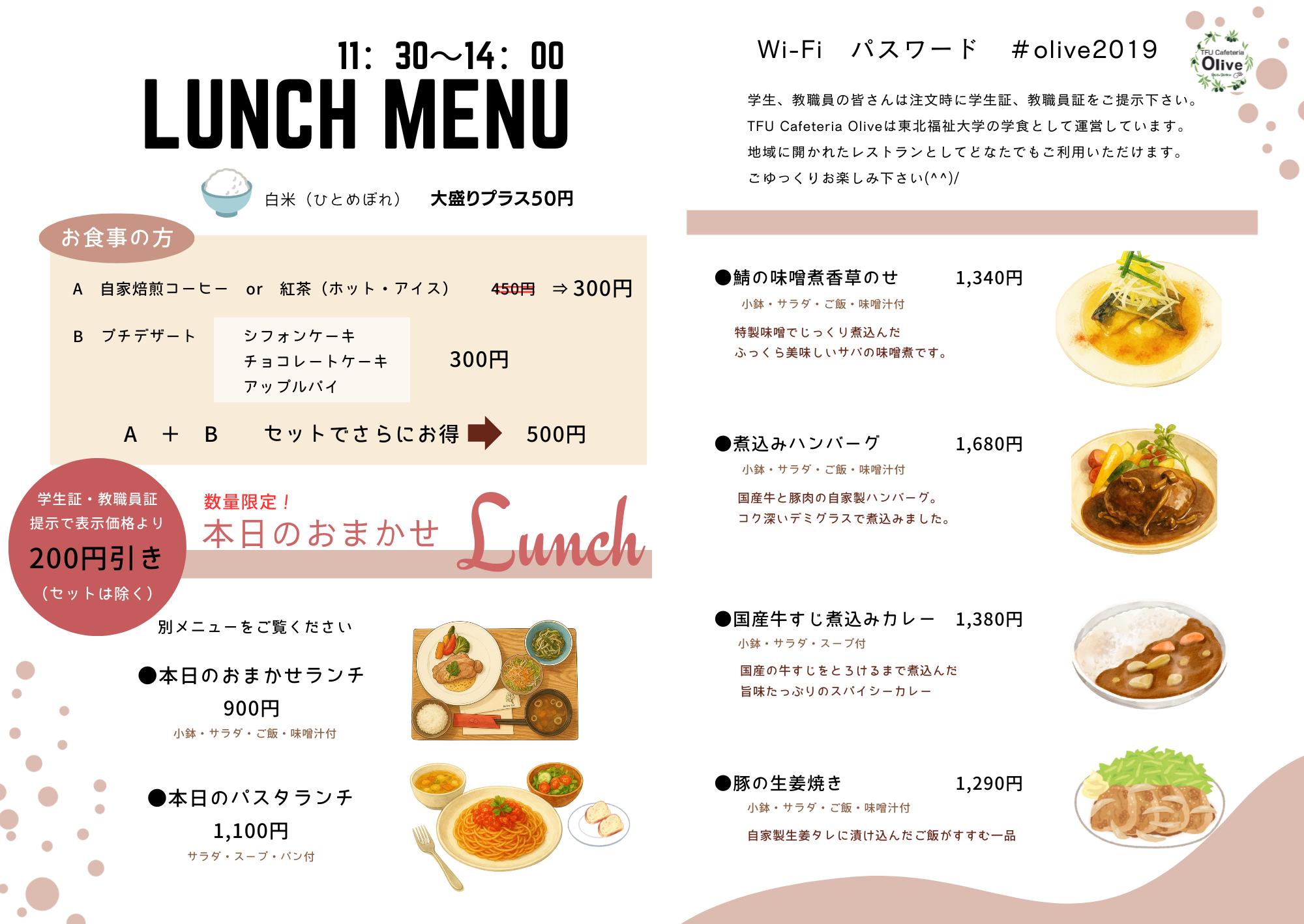 ※学生・教職員はお食事200円引き、スイーツ・飲み物は100円引きになります(学生・教職員証の提示が必要・セット商品は除く)