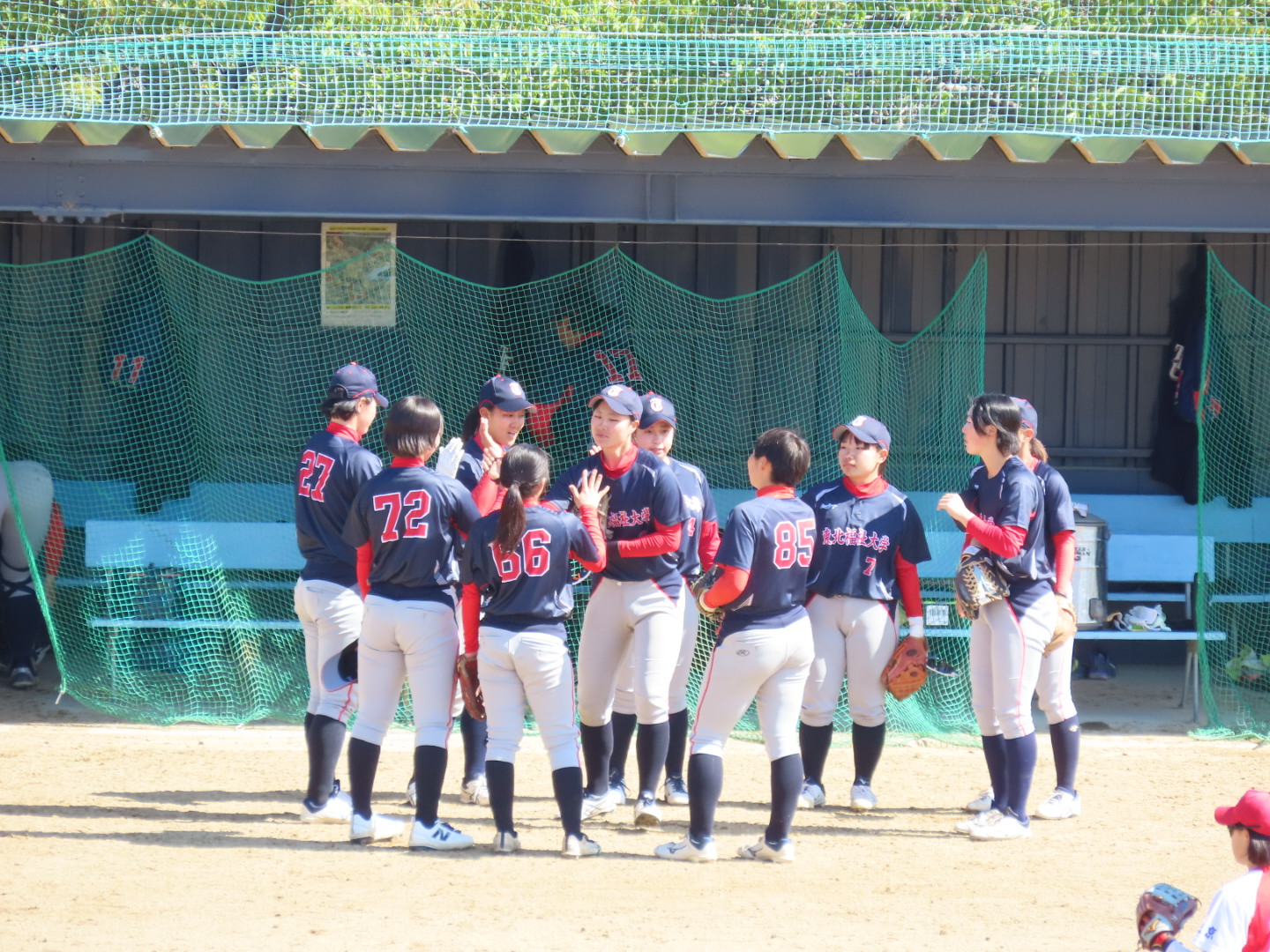 熊野市長杯4日目の1試合目は東海学園大学Bとの対戦でした。1回裏、2アウトランナー2塁からセンター前にヒットを打たれ、1点を先制されます。3回裏、東海学園大学Bの連続ヒットが続き、2点を追加されます。4回表、4番須藤(青森:柴田)のヒットから連打が続き、6番高橋(福島:帝京安積)と7番立木(埼玉:星野)のエンドランが決まり、2点を返します。5回表、3番雪野(広島:安田女子)のセンターを抜けるヒットによって2点を追加します。5回裏、ショート石川(菜)(福島:帝京安積)のダブルプレーにより守備からリズム良く攻撃に繋げます。6回表、2アウトランナー2塁から9番岩本(広島:安田女子)のヒットで1点を追加します。6回裏、守備のエラーも絡んで1点を追加します。7回表、代打小松(心)(秋田:新屋)が四球で出塁すると、連打が続き、2点を追加します。7回裏、リエントリーした桑原(福島:学法石川)が無失点で抑え、7-4で勝つことができました。