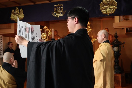 涅槃会は釈尊の命日(2月15日)にその遺徳を偲ぶ法要です。法要では千葉公慈学長が導師を務め、四年生の金子朋永さんが維那、同じく田中恵人さんが送迎、荒木道憲さんが堂行、三宅俊翔さん、松永俊永さん、北条由也さんが殿行、木村孝耀さんが供真を務めました。 続いて行われた草木供養は、国見キャンパスの新キャンパス建設工事に伴って伐採される樹木のご供養の法要です。工事関係者の方々も参列されました。