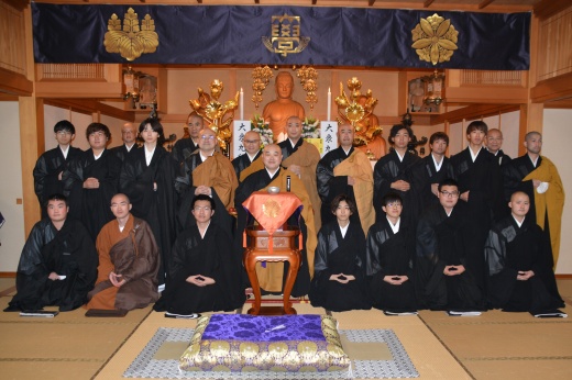 本学では仏教専修科学生の講義日程の関係で10月19日18時より、千葉学長を導師として仏教専修科教職員及び学生によって国見キャンパス法堂でこの達磨忌法要を開催しました。とりわけ今年4月に入学した新入生にとっては、初めての正式に衣を着ての法要随喜でした。着物も着られなかった学生が、半年間で立派な法要を務めるようになったことを千葉学長に褒められるほど、立派に配役を果たされました。