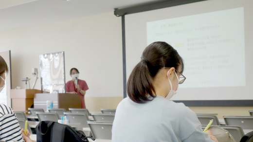 スライドで資料を見ながら講義を聞くほか、グループワークで活動したりします。(岩間さん)