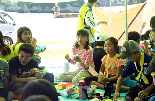 到着後はセレモニーと準備体操のあと、メインのプログラムである島探検とカヌー体験を4班に分かれて行いました。好天にも恵まれ、参加した小学生は、大学生のお兄さん、お姉さんたちと一緒に大自然の中を動きまわり、心地良い汗を流していました。