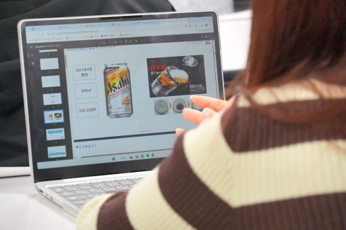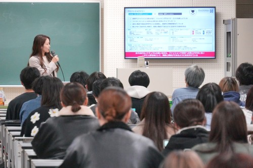 講義では、心理学の必修科目「心理学研究法」で扱うアンケート調査が、実際の企業のマーケティングや商品開発の現場でどのように活かされているのか、具体的な事例とともに紹介されました。