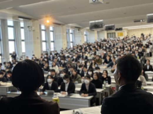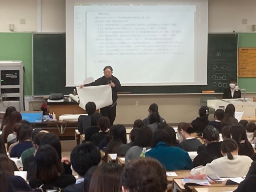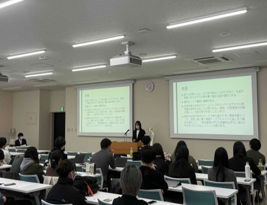 全体会では、宮城県教育庁特別支援教育課課長補佐 大友きか子氏、仙台市教育局国際教育推進課主任指導主事 佐藤陽介氏、本学教授 長田徹氏によるパネルディスカッションが行われました。「個別最適な学びと協働的な学びの一体的な充実を目指して」の意義と背景を確認し、宮城県の特別支援教育、仙台市で設置をめざす新教科・国際探究におけるそれらの具体について紹介されました。学生との質疑応答もあり、教育現場の今を考える機会となりました。
