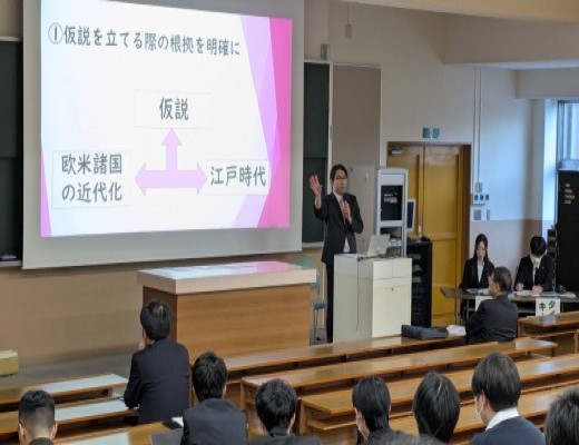 第3分科会(中等社会)では、中学校・高等学校の教諭となった本学卒業生の実践報告、質疑応答を通して、今の中等社会科における「個別最適な学びと協働的な学びの一体的な充実」の考え方と実践について考えました。個別的な学びから協働的な学びに移行する際の学習端末の有効活用、社会科における探究的な学びの先進的な取組が紹介されました。分科会の結びには本学教授 下山忍氏より実践報告を価値付けする講評がありました。
