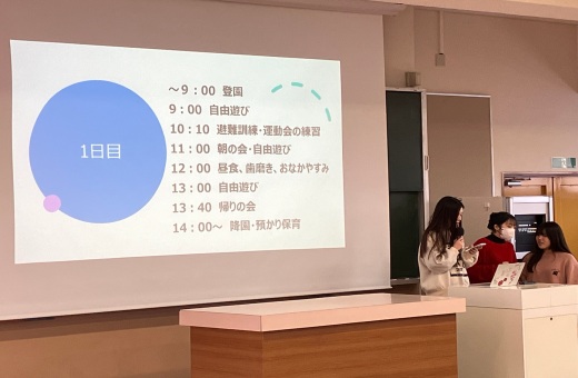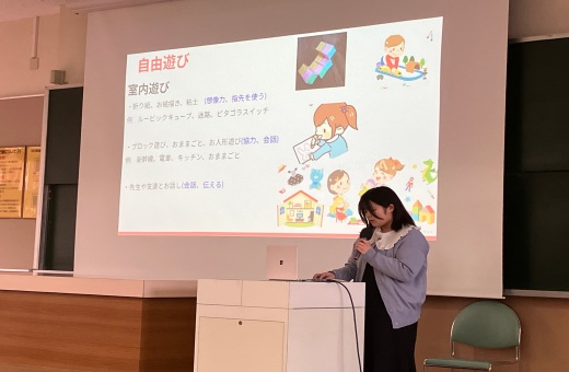 【教育学科】福聚幼稚園での保育実践活動に参加した幼保コースの1年生が実践報告を行いました
