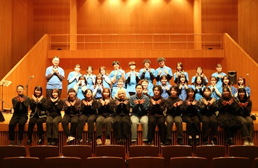 舞台には、鳩原ゼミの皆さんも心強い応援団として駆けつけてくれました。鳩原先生の伸びやかな歌声に合わせ、鳩原ゼミの学生たちがしなやかな手話で歌を披露すると、客席の渡会ゼミ生も一緒に手話を行い、会場内は胸が熱くなるような一体感に包まれました。その後に行われた2つのゼミ合同による合唱では、独自のアレンジを加えた「つばさをください」が披露され、迫力ある重厚な響きがホール全体に行き渡りました。