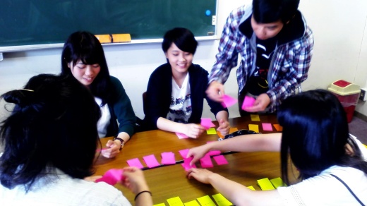 6月28日、リエゾンゼミⅠ27組(担当:三浦、茂木)では、6月21日に行われた朴木山キャンパスの活動を振り返る活動を行いました。東側と西側2つのコースに分かれて活動を行ったため、それぞれのコースで五感を通して集めた情報を各自付箋紙に書き出しました。次に、聴覚・視覚・触覚・嗅覚・味覚5つのカテゴリーに分類し、グループで情報交換を行い、最後に全体で情報共有を行いました。
