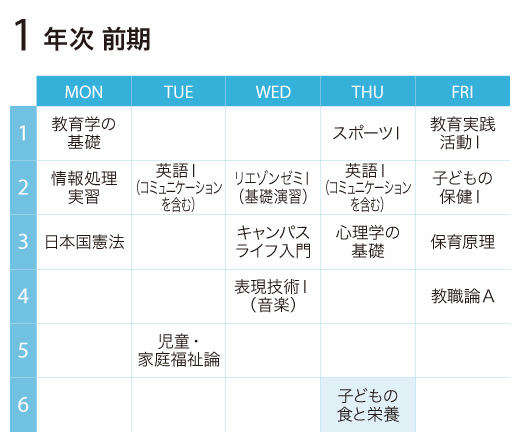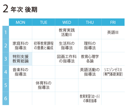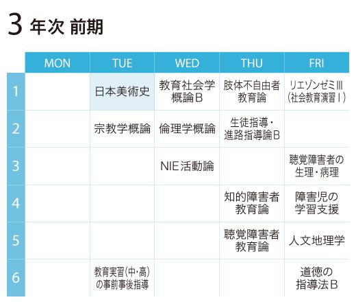教育学科先輩学生の時間割とインタビューを掲載しています。(内容は2020年掲載時点。時間割にある科目名は変更となる場合があります)