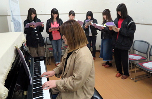 ピアノは、保育園、幼稚園での代表的な音楽活動です。この授業では、ピアノを用いた弾き歌いの技法や現場での即戦力を養い、音楽的な表現力を生かせるようコードネームの基礎知識を習得します。コードネームが付いた歌に、学生がオリジナルの伴奏譜を作成し弾き歌いを行い、またアレンジをして発表するという実践面での訓練も行っています。