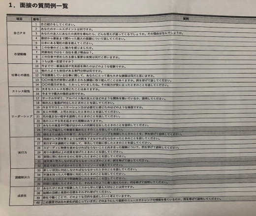 全40項目の面接での質問例一覧が配布されました。内容については写真の通りです。