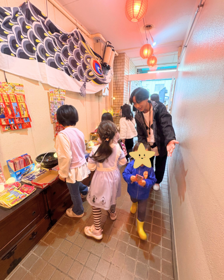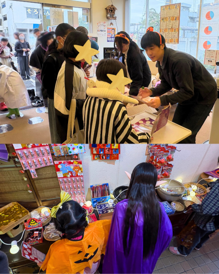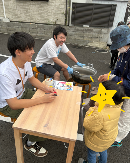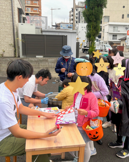 7月に八幡杜の館で開催したワークショップ「考えよう!私たちにできるSDGs:雑がみで七夕飾りを作ってみよう」や、10月のプレイベント「雑がみでハロウィングッズを作ろう!」に参加したお子さんもたくさん駆けつけてくださり、「また会えたね!」「車に気を付けて、お菓子をもらいに行ってね」など、子どもたちと学生との会話も弾みました。