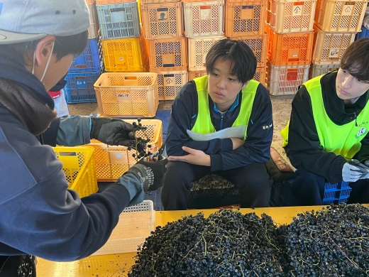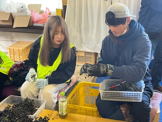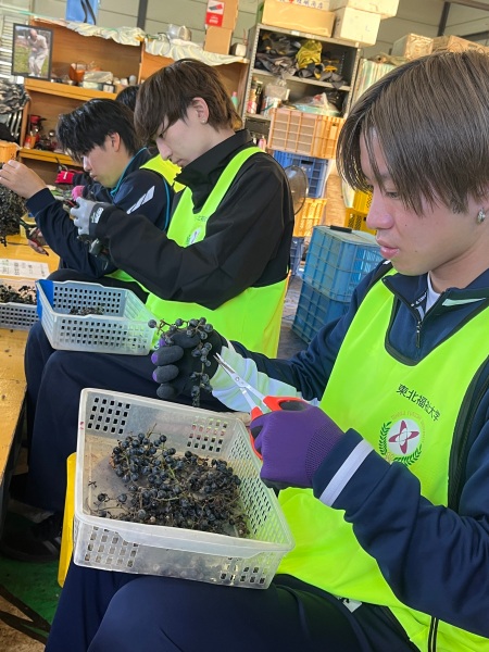 初日はマルシェのテントを立てる準備を行いました。2日目のマルシェ初日は、荒天の予報により中止。代わりに役場の方に震災伝承施設を案内していただきました。午後は、野田村の特産品である山ブドウの選果作業のお手伝い。地域おこし協力隊をきっかけに野田村に移住した方と作業を通じて交流しました。