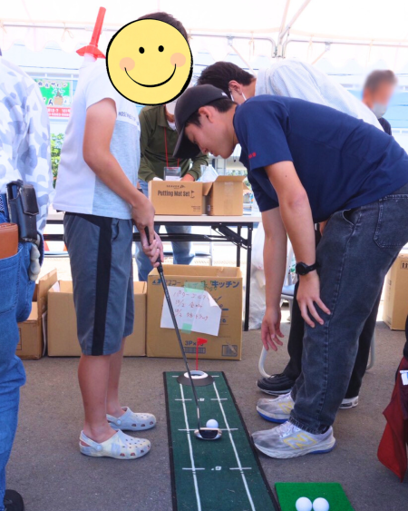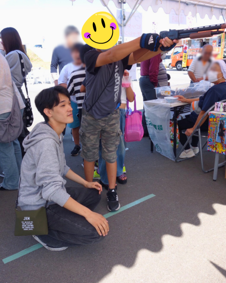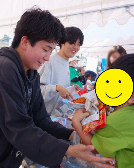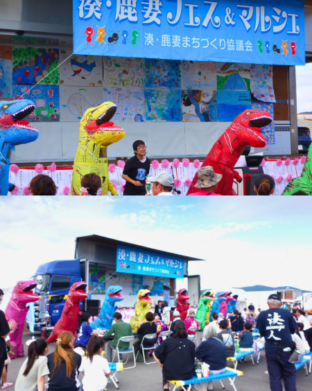 当日は、子どもたち向けを中心とした「フェイスペイント」「射的」「パターゴルフ」「お菓子つかみどり」「米すくい」「防災ゲーム(国土交通省ブース)」といった出店企画を、地元の方々と一緒に運営しました。また、祭りの雰囲気を学生の視点でスナップする写真撮影も担当しました。恐竜の着ぐるみと一緒にダンスを披露する一幕もありました。