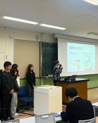 1月14日、共生まちづくり学科一期生が、リエゾンゼミⅠ・まちプロの学びを通して、地域やまちの課題を探究し、「誰もが自分らしく生きられる共生のまちづくり」を目指して、その解決策を提案する研究報告会を開催しました。各クラスから代表1チームが発表し、学科教員から今後の研究につなげるアドバイスをもらいました。