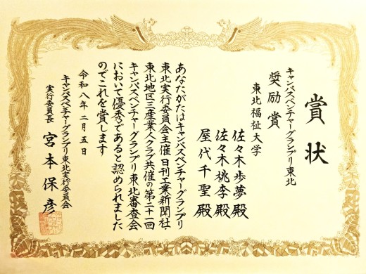 第21回キャンパスベンチャーグランプリ(CVG東北)にて「奨励賞」受賞!