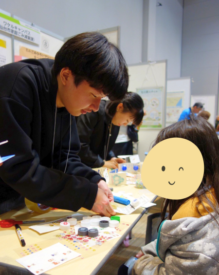 ミニワークショップでは、来場者に、ペットボトルのフタと牛乳パックを再利用した「ミニカスタネット」の制作を体験してもらいました。 ワケルキャンパスの活動内容を知ってもらうだけでなく、大学生とコミュニケーションを取りながら楽しくエコについて考えてもらう機会をつくることができました。