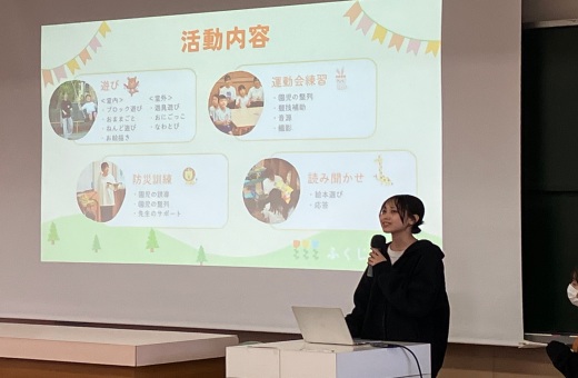【教育学科】福聚幼稚園での保育実践活動に参加した幼保コースの1年生が実践報告を行いました
