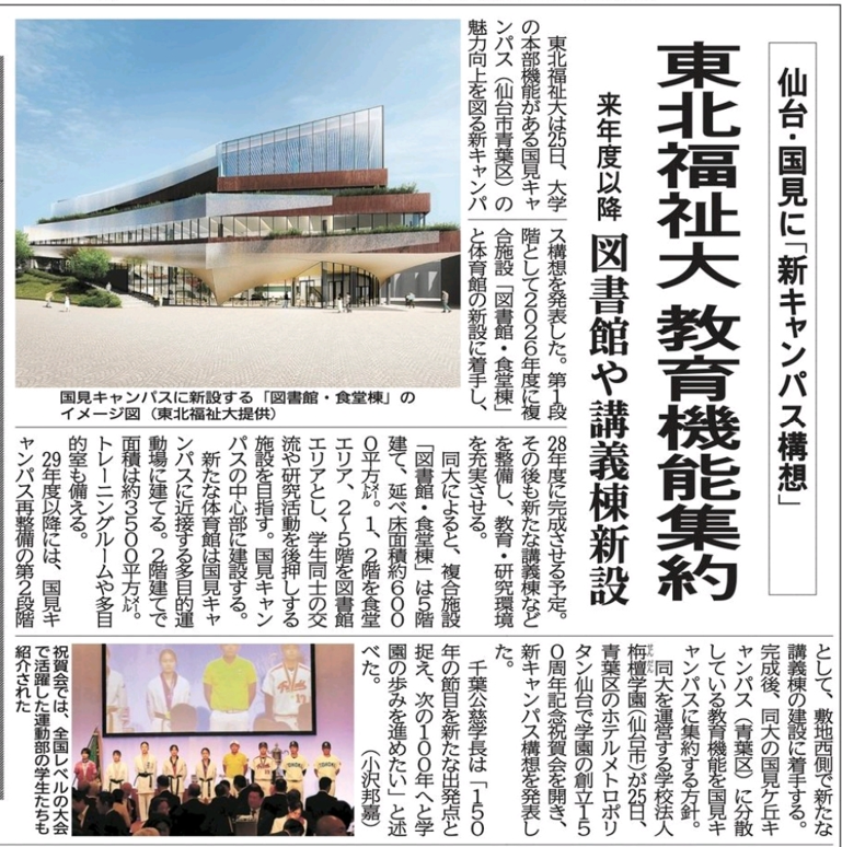 発表は、学校法人栴檀学園創立150周年記念祝賀会(ホテルメトロポリタン仙台)の中で行われました。本記事が26日(金)の河北新報朝刊に掲載されました。