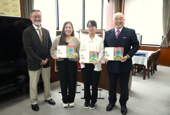 千葉学長は、出来上がったばかりの新しいカレンダーを笑顔でご覧になりながら、