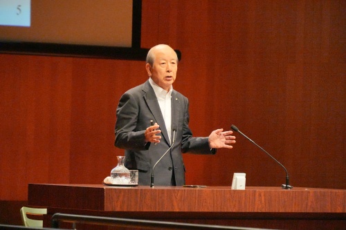 第1部では、日本ビジネス界のトップランナーであるアイリスオーヤマ株式会社代表取締役会長の大山健太郎氏に、「ウェルビーイング社会の実現に向けて」と題して、特別講演をいただきました。大山会長は、「会社の目的は、一番目が永遠に存続すること、二番目が健全な成長を続けることによって社会貢献し利益の還元と循環を図ること、そして三番目が一番大事で、働く社員にとって良い会社を目指すこと。Win-winの関係が大事」と話し、「40代からの座右の銘は『心身一如』で、これがウェルネスでありウェルビーイングなんだろうと思います。それはアイリスオーヤマの経営に生かされています」と、その経営理念について語りました。