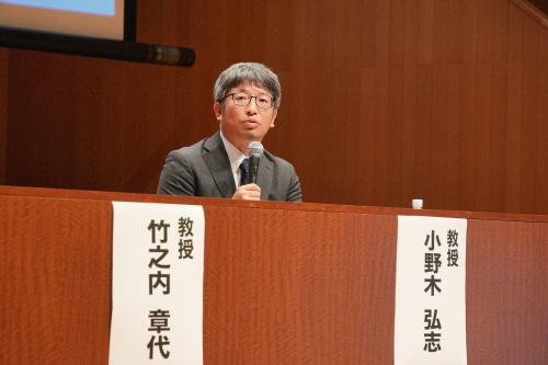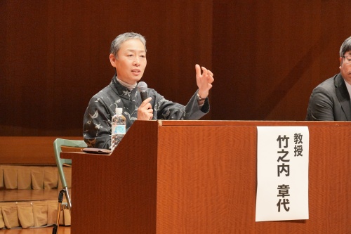 第2部では、総合福祉学部社会福祉学科の竹之内章代教授、健康科学部保健看護学科の小野木弘志教授、教育学部教育学科の黄淵煕教授、共生まちづくり学部共生まちづくり学科の森明人教授の4人がパネリストとなり、「ウェルビーイング社会の実現に向けた挑戦」をテーマに、それぞれが活動事例を報告しました。その後、阿部裕二副学長がモデレーターとなってパネルディスカッションを展開し、課題と展望を念頭に、新しい福祉の在り方について議論が繰り広げられました。