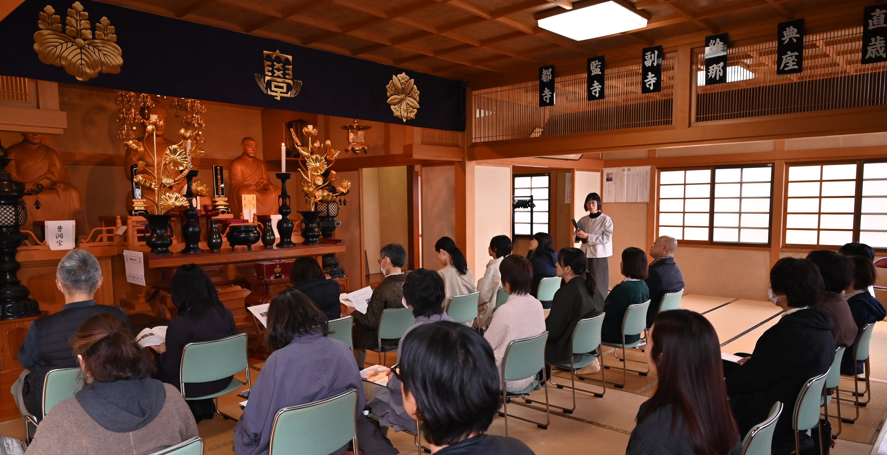 はじめに教育学科の門脇佳代子准教授より、本学の成り立ちを踏まえながら法堂や坐禅堂の仏像について講話を頂きました。堂内に安置されている「一仏両祖像」を前に、建立経緯や彫刻としての表現的特徴が説明され、皆さん熱心に耳を傾けていました。