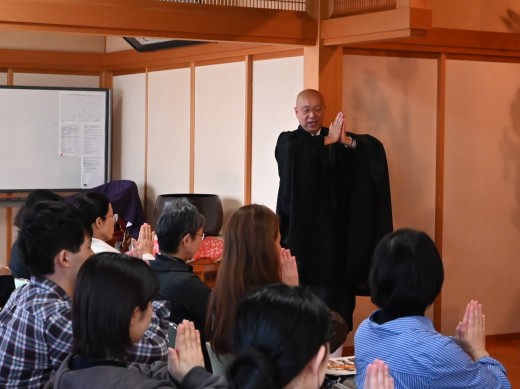 続けて仏教専修科講師を務める佐藤泰伸先生が、坐禅の心得や作法を説かれた後、一行は坐禅堂へ。胸の前で左手の親指を内にして握り、右の手のひらで覆う「叉手(しゃしゅ)」で入堂し、「聖僧文殊菩薩坐像」の前では合掌で頭を下げ(合掌低頭・がっしょうていず)、それぞれが座る位置へと向かいました。約10分間の坐禅中、堂内はピンと張り詰めた空気に包まれました。