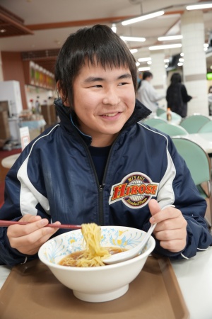 昼食は、181ホールの学生食堂で食べました。食堂には沢山のメニューがあり、選ぶのが楽しく、醤油ラーメンセットミニカレー付きを食べましたが、美味しかったです。大学生の皆さんは会話を楽しみながら、昼食を満喫していました。