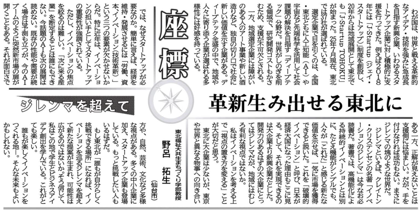 共生まちづくり学科の野呂拓生教授が、11月18日(火)の河北新報朝刊紙面『座標』欄に執筆しました。5回目のテーマは、スタートアップ企業とイノーベンションについてです。イノベーションを考える上では「視点の置き方を変える」ことが大切だと話し、さまざまな視点から、東北が「誰もが自分らしく挑戦できる場所」になれば、イノベーションを巡るジレンマを超えて新たな提案が生まれ、可能性が広がるのではないか」と、提言しています。