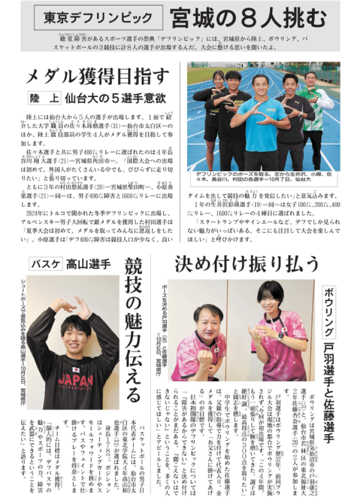 河北新報社が発行しているこども新聞「週刊かほピョンプレス」(11月9日)に、『東京デフリンピック/宮城の8人挑む』と題して、教育学科2年の佐藤杏奈さんが紹介されました。東京デフリンピックには、宮城県から陸上、ボウリング、バスケットボールの3競技に計8人の選手が出場します。