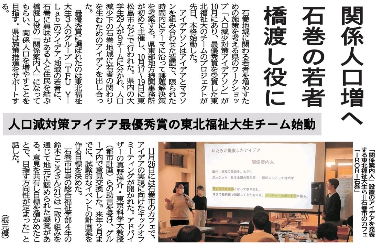石巻地域に関わる若者を増やすための施策を考えるワークショップ「人口減少対策アイデアソン2025」で、最優秀賞を受賞した本学福祉行政学科の鈴木こころさん(4年)、阿部竜乃介さん(3年)、浅野日向子さん(2年)のチーム TFU Y-Labが、11月26日(水)に石巻市内のカフェで行われたアイデアの実現に向けたキックオフミーティングに参加し、本格始動しました。その模様が12月7日(日)の河北新報朝刊に紹介されました。
