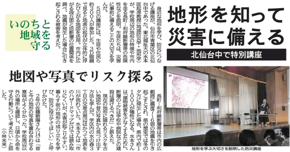 【新聞掲載情報】水本准教授 地形を知って 災害に備える 北仙台中で特別講座(河北新報)