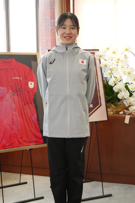 2月21日に福岡市・海の中道海浜公園で行われるアジア陸上競技クロスカントリー選手権大会 福岡2026年 シニア女子10k日本代表選手に本学の女子駅伝部の村山愛美沙さん(福祉心理学科3年)が選出され出発前、大学本部に報告しました。