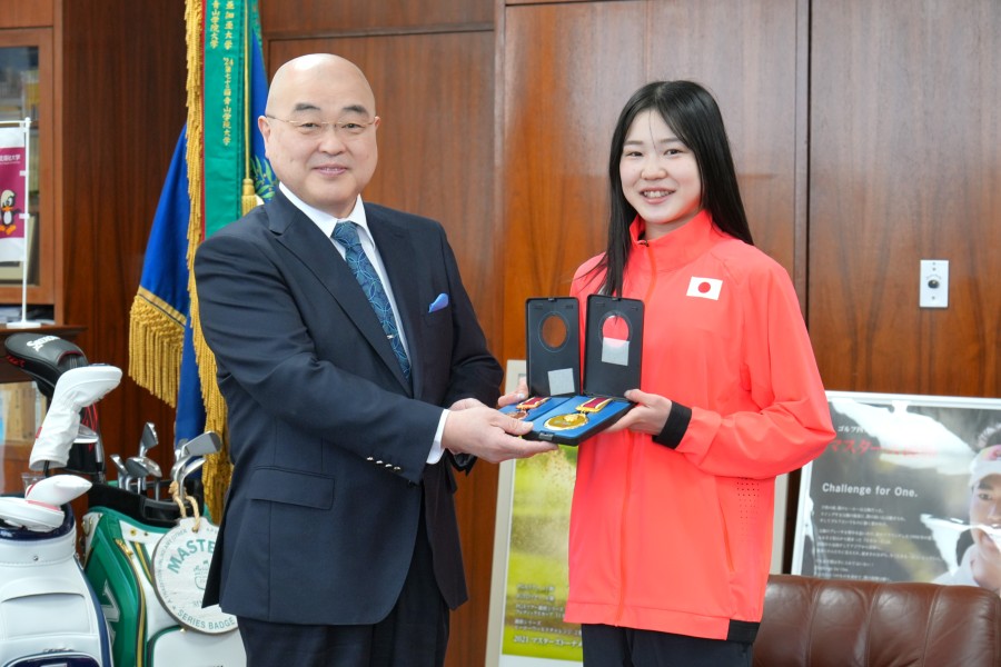 2月27日に「第18回アジアクロスカントリー選手権大会」において、個人で銅メダル、団体で金メダルに輝いた、本学女子陸上競技部の村山愛美沙さん(福祉心理学科3年)が、メダルを持参し今大会の結果や今後の目標などを報告しました。