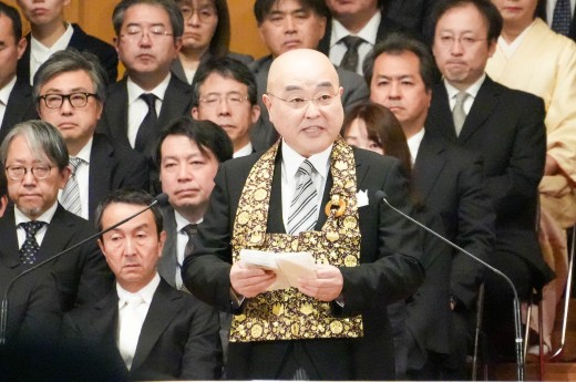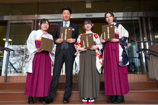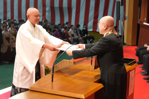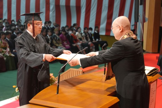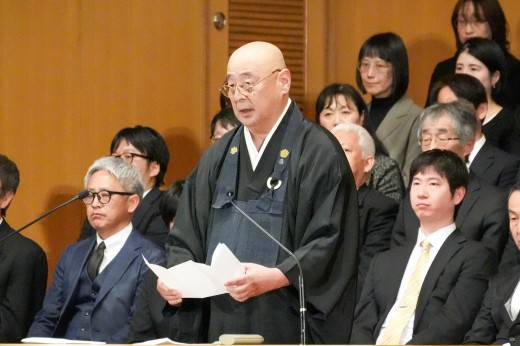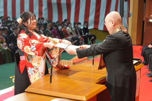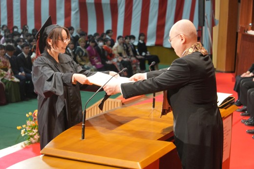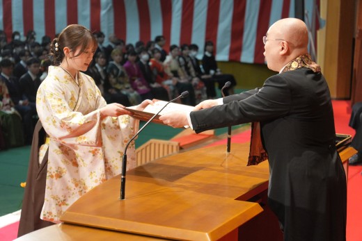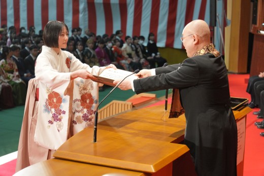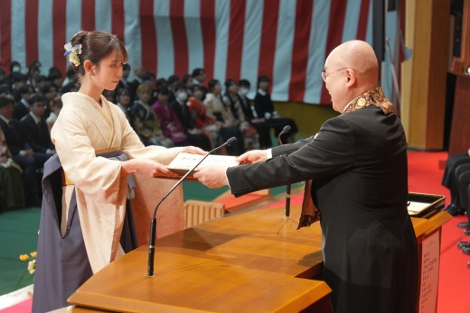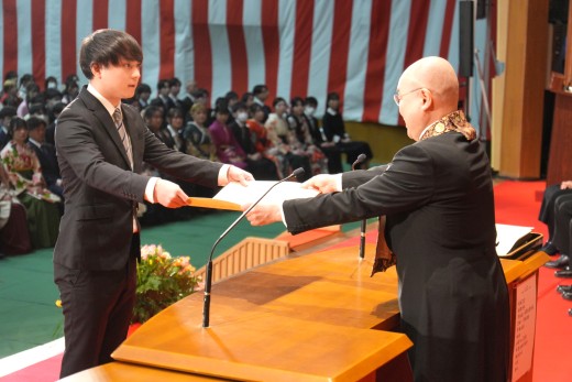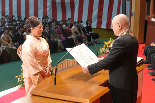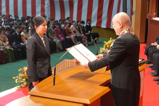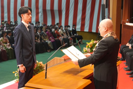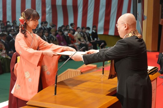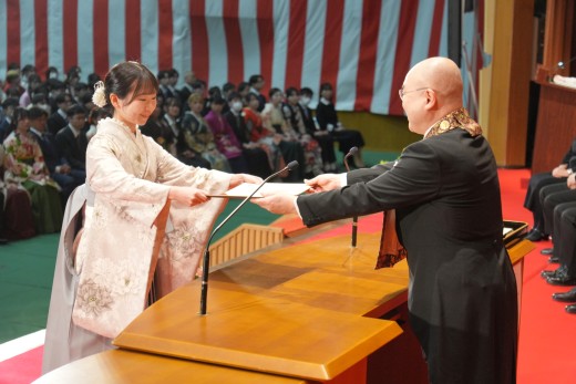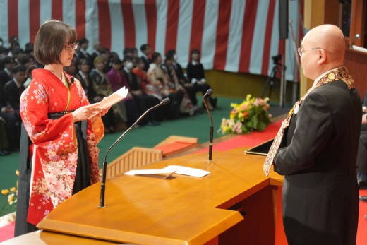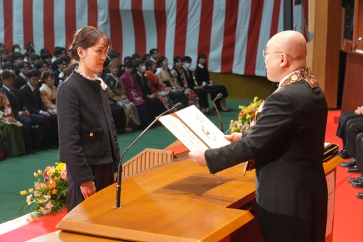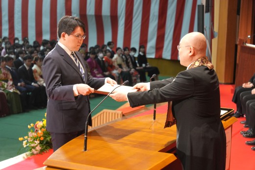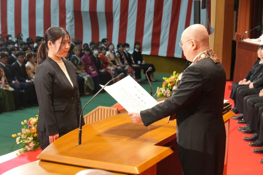 千葉学長は「ご卒業ならびに修了おめでとうございます。ご家族、保護者の皆様には、心よりお祝いと感謝を申し上げます。本学でのかけがえのない実践的な学びが、きっと皆さんのこれからの人生を切り拓いてくれることでしょう。いざ、堂々と時代の旗手となり、「行学一如」と「自利利他円満」の教えをもって、日本をそして世界を導いてください」と、式辞を述べました。
