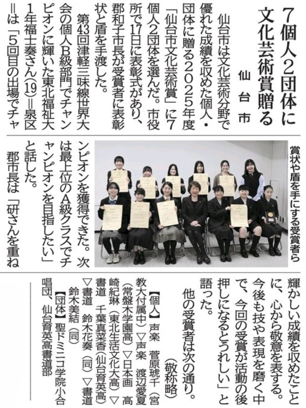令和8年3月17日(火)に仙台市役所本庁舎で、令和7年度仙台市文化芸術賞の表彰式が行われ、その模様が22日(日)の河北新報朝刊に掲載されました。本学から、福士 奏さん(福祉行政学科1年)に表彰状および記念盾が授与されました。福士さんは、今回で2度目の受賞となります。