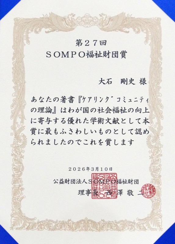 3月10日(火)、損害保険ジャパン本社ビル(東京都新宿区)で行われた公益財団法人SOMPO福祉財団(西澤敬二理事長)の社会福祉学術文献表彰事業で、本学社会福祉学科の大石剛史准教授が執筆した文献『ケアリングコミュニティの理論ー社会福祉の新しい地平を拓く地域福祉のメタ理論』が、「SOMPO福祉財団賞」を受賞しました。