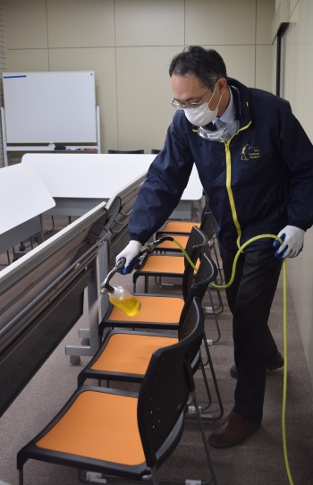 当キャンパスの総合建物管理業務を担う、株式会社福祉工房のスタッフが作業を実施。エレベーター内のボタンから各フロア教室のドアノブ、壁面、椅子やテーブル、トイレなどの設備一切を、特殊なスプレーガンで丁寧にコーティングしました。